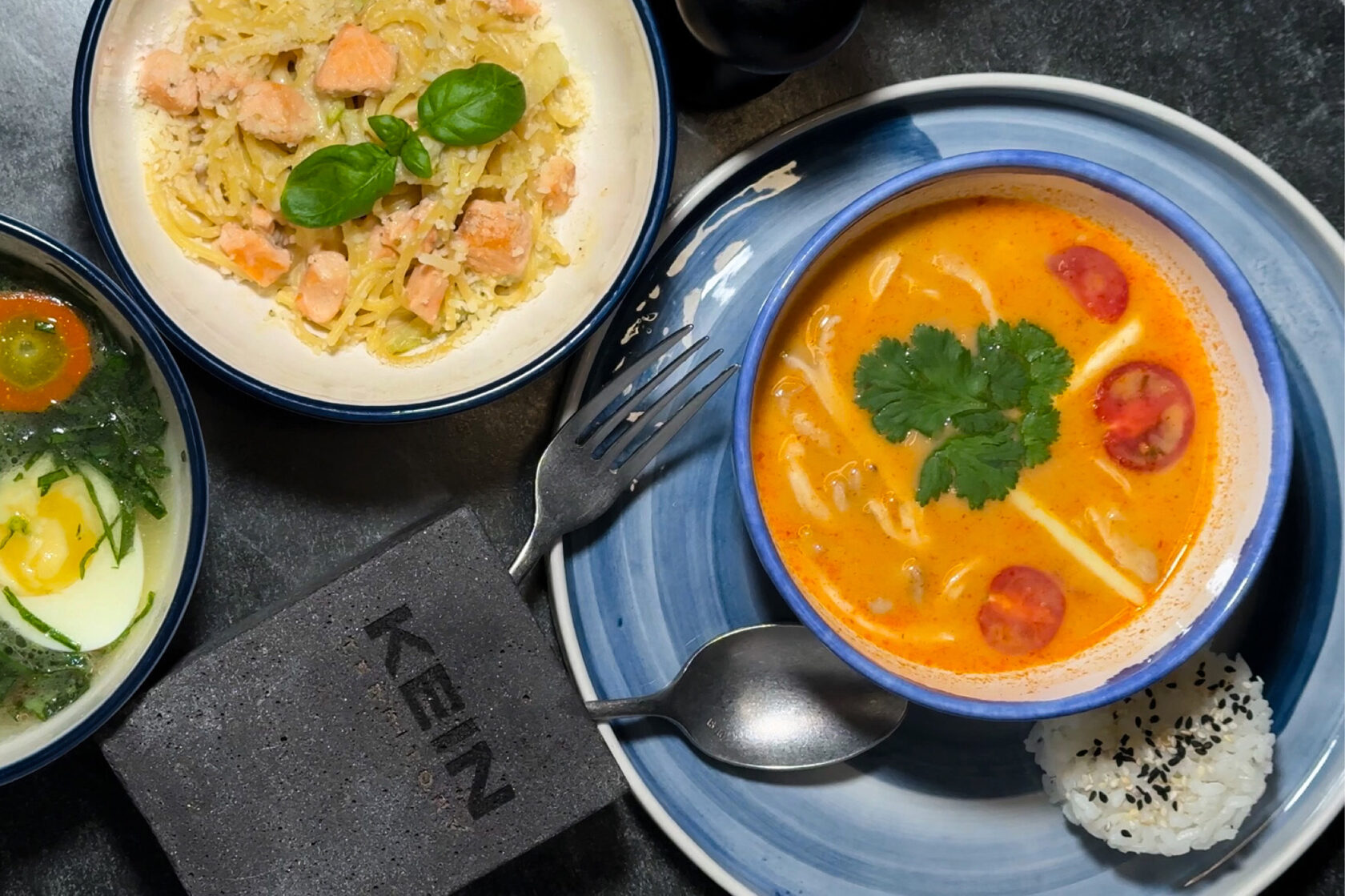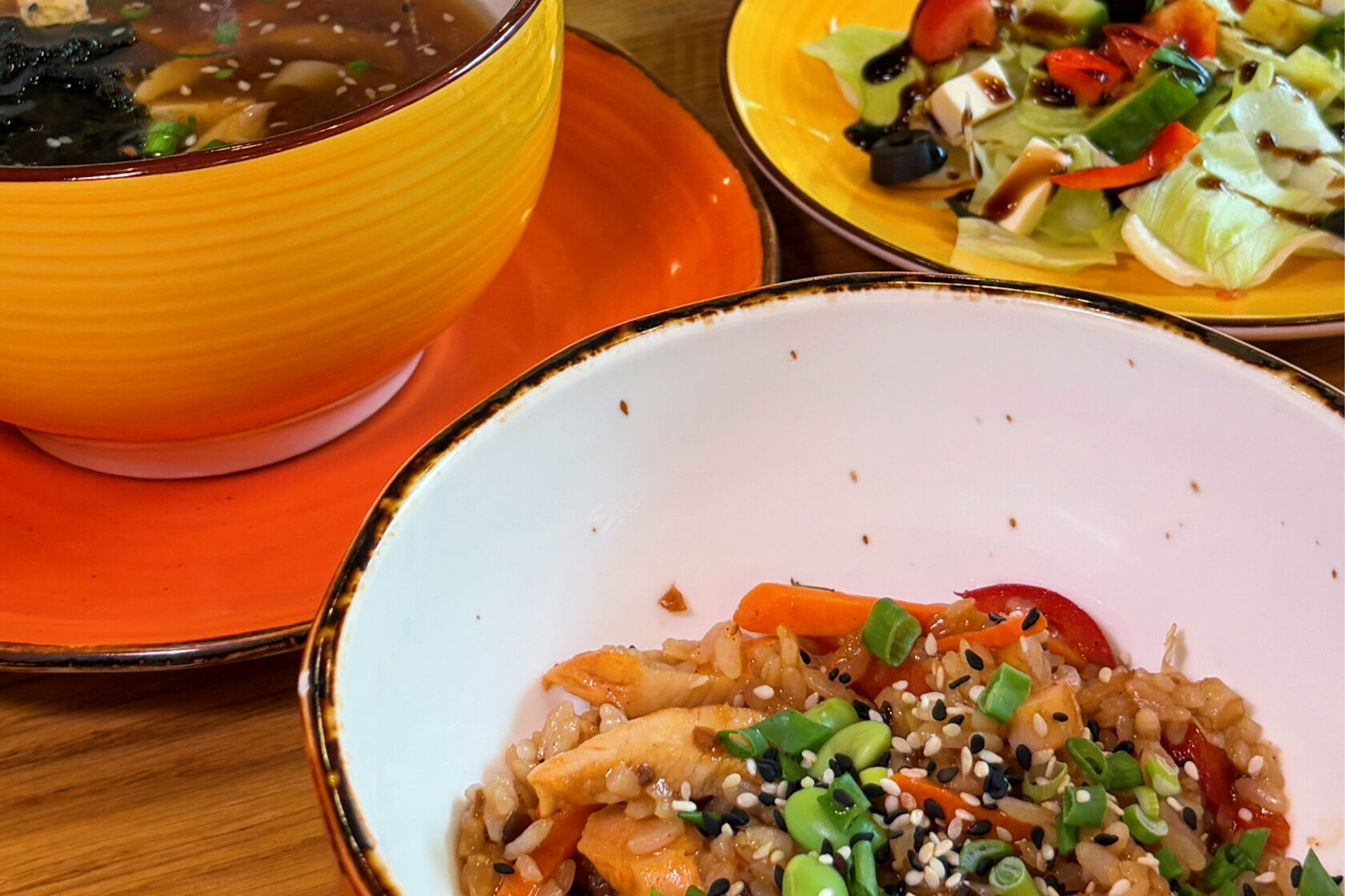 В будни действует бизнес-меню: горячее, супы, салаты, десерты. Позиции обновляются каждые три-четыре недели. Сейчас фавориты гостей — поке со снежным крабом и том-ям с треской.