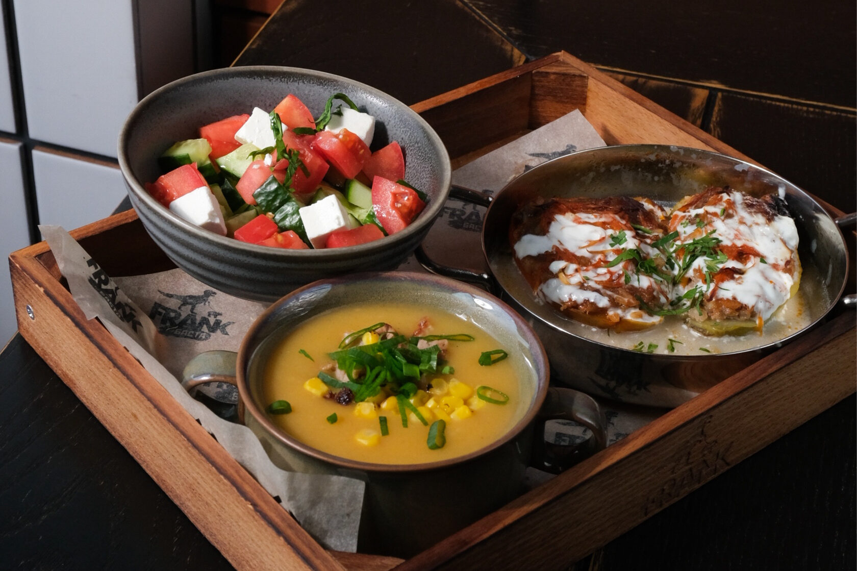Бизнес-ланч ресторана FRANK By БАСТА состоит из трех блюд — салата, супа и горячего. Среди салатов можно выбрать свежий овощной с фетой, с печеной свеклой и козьим сыром или картофельный салат с реберным мясом. На первое — взять куриный бульон с вермишелью и яйцом, овощной суп с фрикадельками или суп-пюре с кукурузой и реберным мясом. А на горячее — попробовать фаршированный перец, шницель с хрустящим коул-слоу и томатным соусом или ребра с соусом хойсин и печеным картофелем.