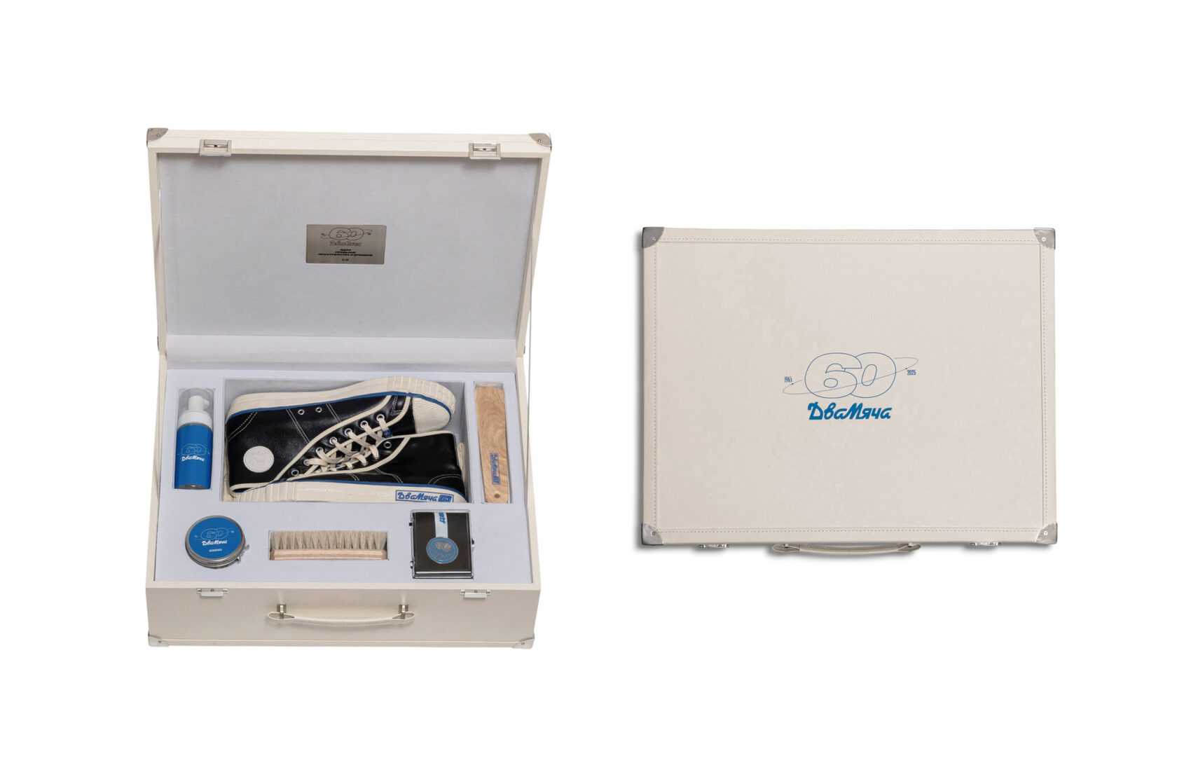 Подарочный кейс от бренда «Два мяча» с юбилейными кедами 1965 года, аксессуарами для ухода, шоппером, деревянными колодками и лимитированной медалью. Это подарок и одновременно коллекционный объект — про прикосновение к истории и движение вперед.