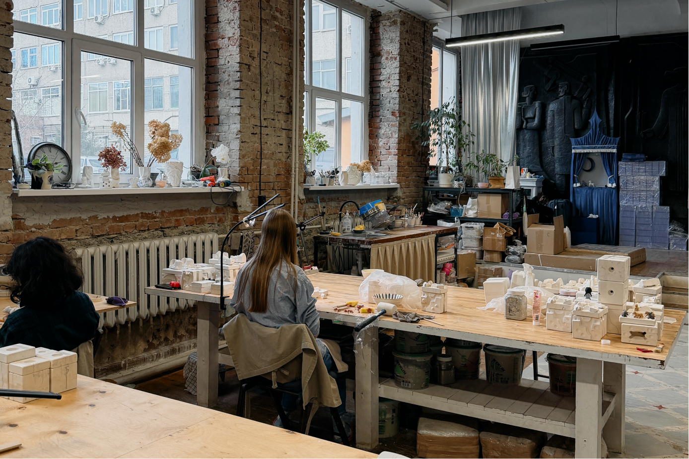 Наша мастерская находится в бывшем актовом зале Института черных металлов на проспекте Ленина, 101/2. Его атмосфера сразу показалась подходящей для творческих инициатив.
