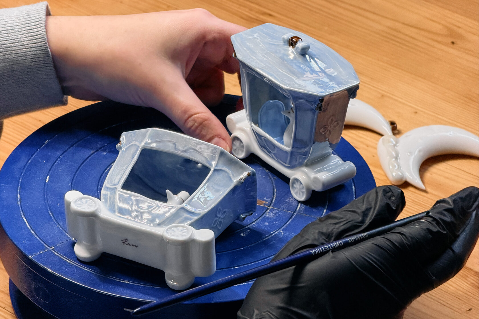 Игрушки изготавливаются в несколько этапов. Начинаем с отливки фарфоровым шликером по разработанным гипсовым формам. Отливку-заготовку сушим и обрабатываем до идеального вида поверхности — это влияет на качество изделия. Обжигаем первый раз в муфельной печи на 950 градусов, чтобы игрушка стала прочнее и была готова к росписи. Далее наш художник расписывает каждую вручную подглазурными красками. Затем идет глазурование прозрачной глазурью, которая после самого высокого обжига на 1200 градусов придает изделию крепкость и стекловидное блестящее покрытие. Потом финальный штрих наших изделий: роспись препаратом золота. Он добавляет игрушкам праздничность.