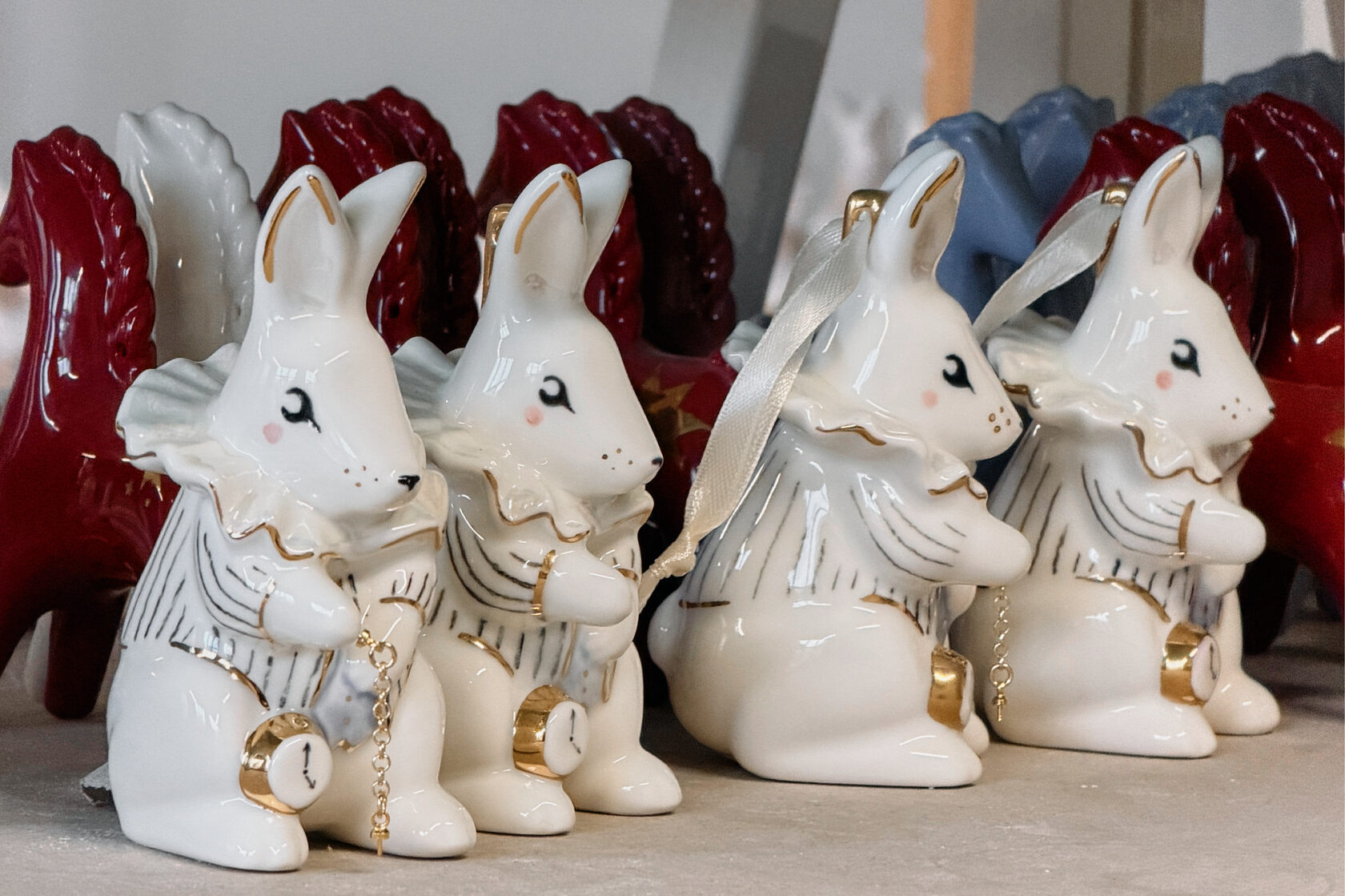 Работу над ними мы начинаем в январе. Сначала рождается идея, концепция года. Мы выпускаем несколько новых игрушек и дополняем основную коллекцию. Все решения принимаются в начале года, а летом начинается финальная разработка, чтобы к сезону все было готово. Чтобы поддерживать несезон, делаем чайные пары, стаканы и вазы. Это скорее смена ритма — сложно быть Дедом Морозом круглый год, особенно когда за окном растут полевые цветы. При этом мне близка тема праздников: кроме Нового года, мы делаем специальные коллекции к Пасхе: подсвечники, пашотницы, топперы и наборы с фарфоровыми яйцами.