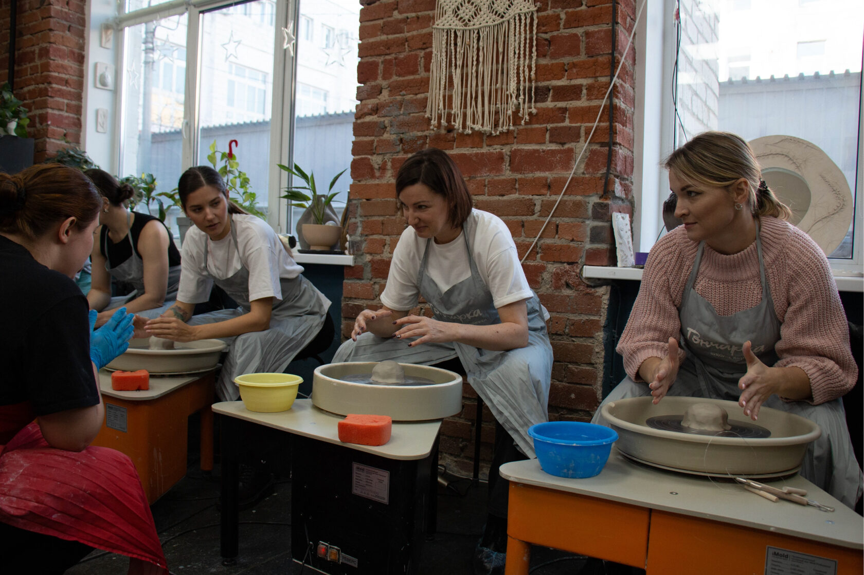 В пространстве собраны гончарные мастерские со стационарными кругами, столами для ручной лепки, печами и широкой палитрой красок и глазурей. Взрослые могут заниматься как в рамках одноразовых мастер‑классов, так и на курсах, которые проходят несколько раз в неделю.
