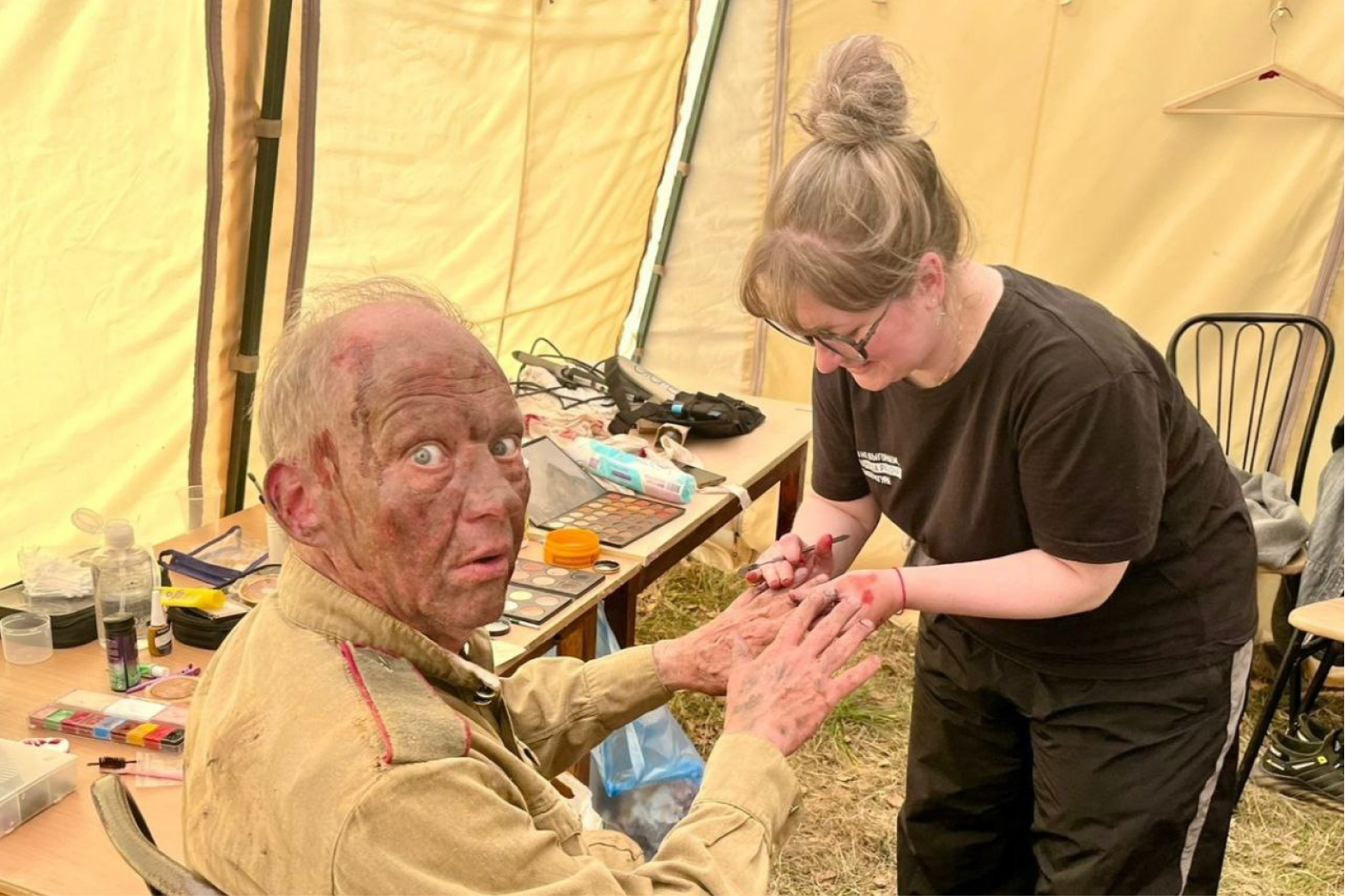 Работа гримера — это еще и серьезная физическая нагрузка: ненормированный график, ранние смены, много часов на ногах. Бывает, один проект еще не закончился, а тебя уже зовут на другой. Плюс не всегда просто работать с капризными материалами — например, масляными красками или гуммозом, из которого создают объемные детали.