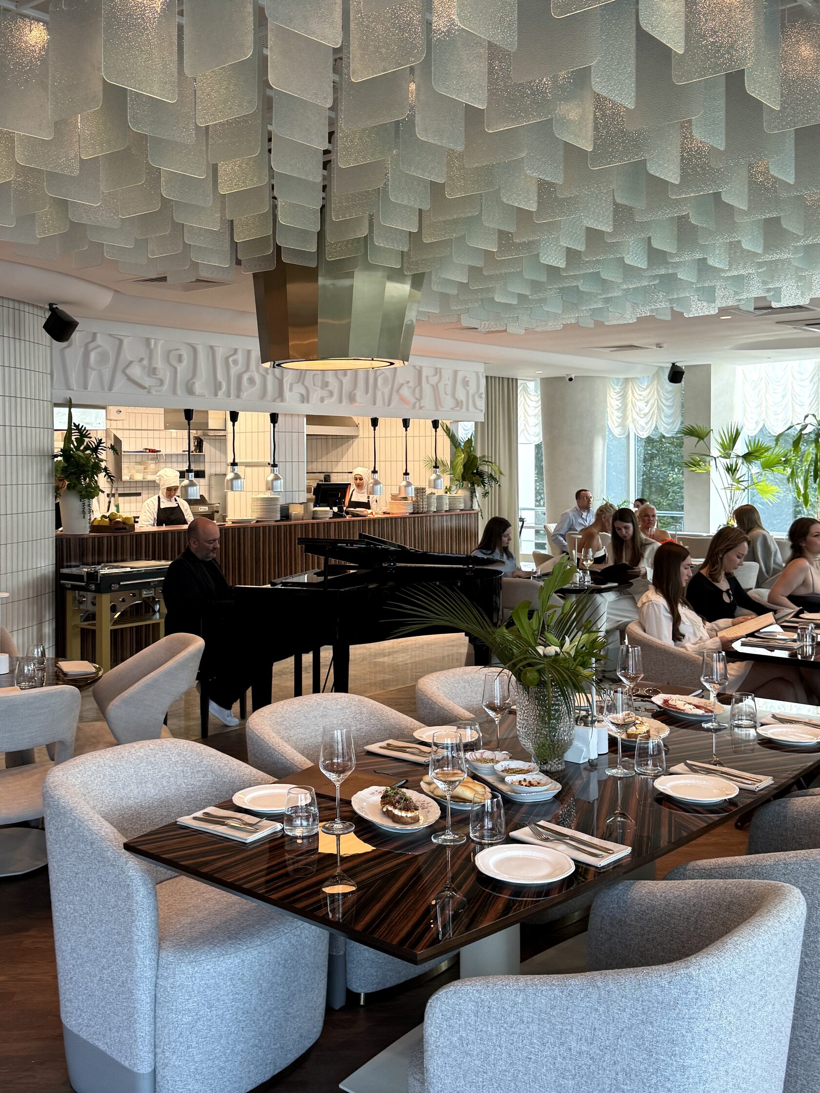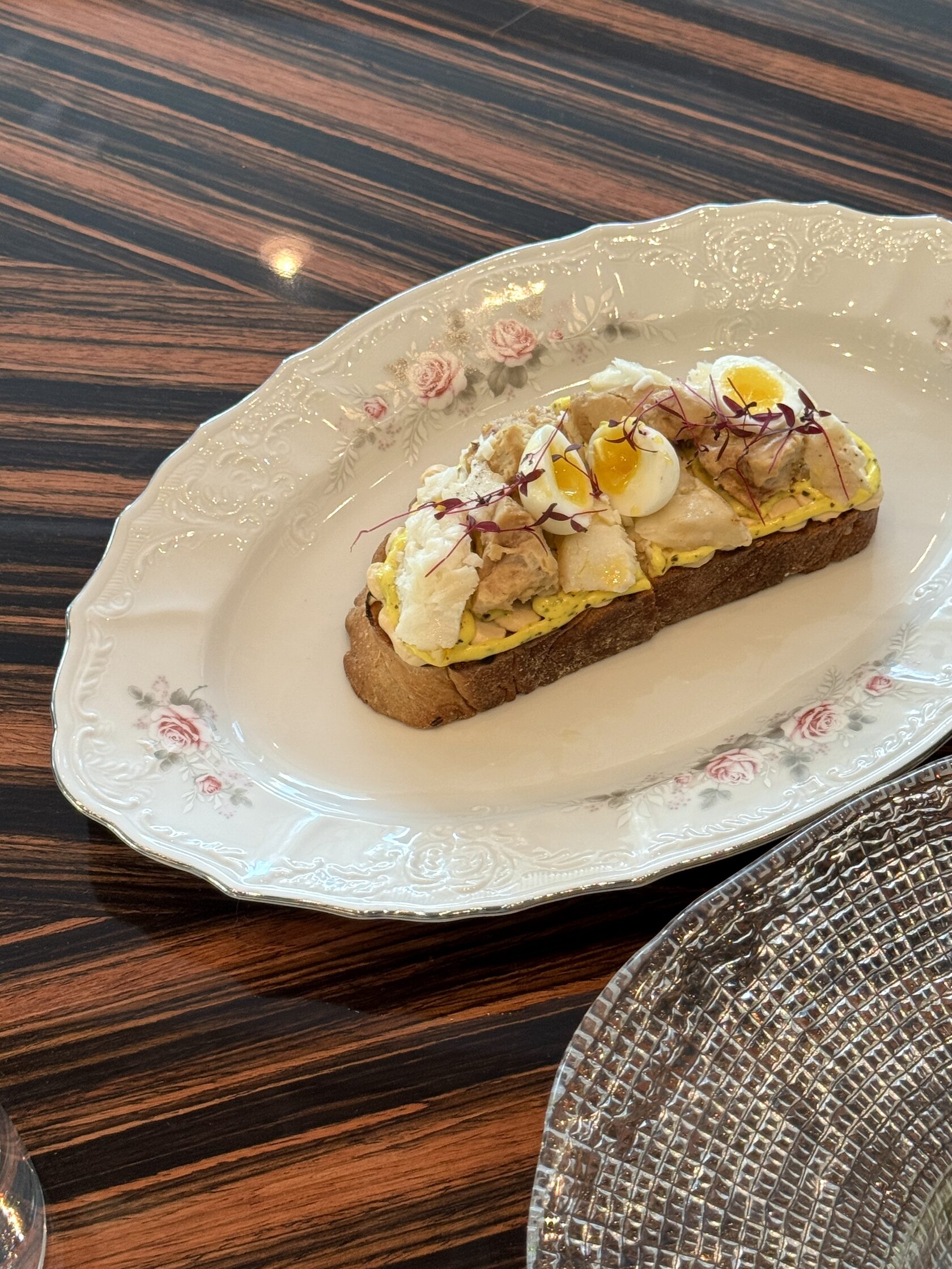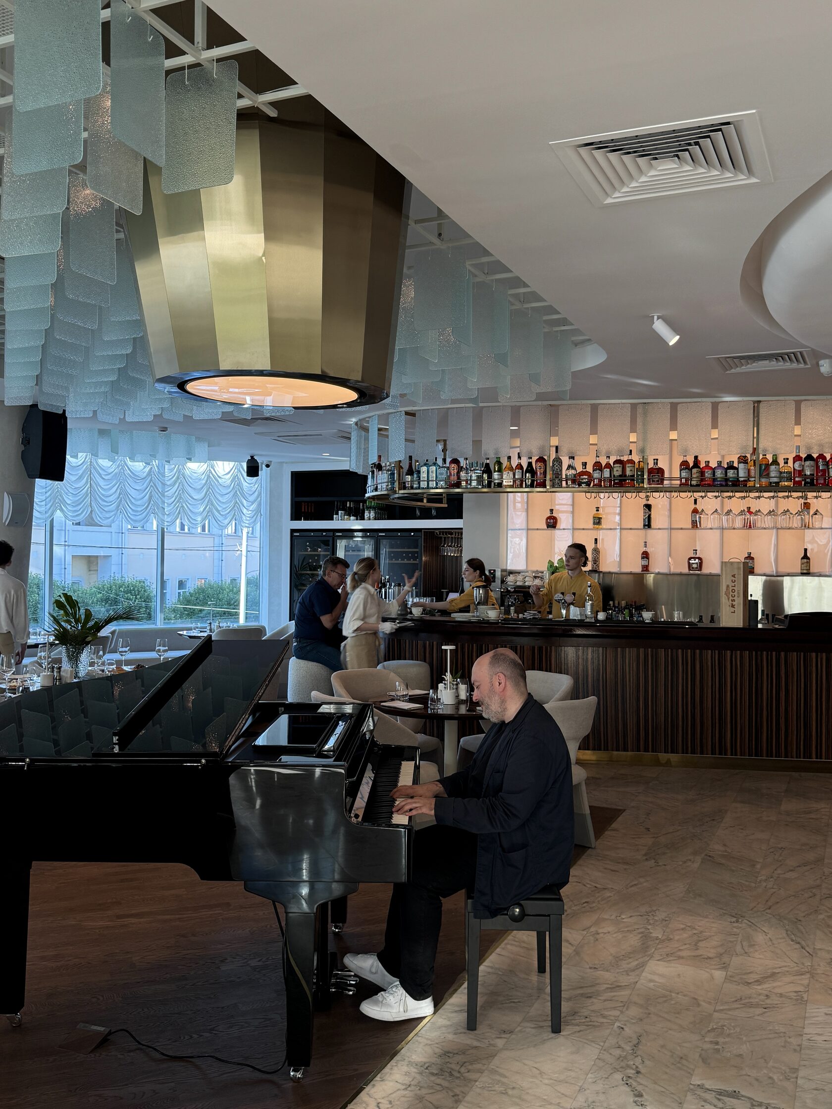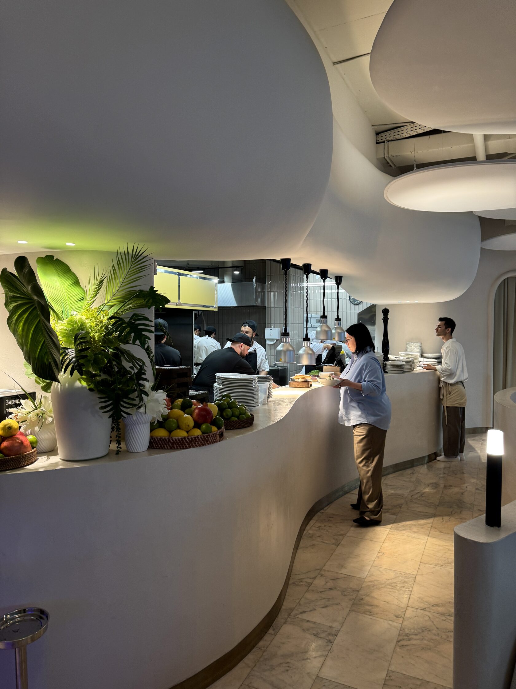С 9:00 до 14:00 в ресторане готовят завтраки. Есть большие комплексные варианты, например, с круассаном, сыром камамбер, яйцом всмятку, мортаделлой, сливочным маслом, паштетом из печени индейки и вареньем из инжира (910 рублей). Еще — вафля с морской форелью слабой соли, яйцами пашот и муссом из пармезана (1050 рублей) или шакшука с сырным кремом и лепешкой шоти.