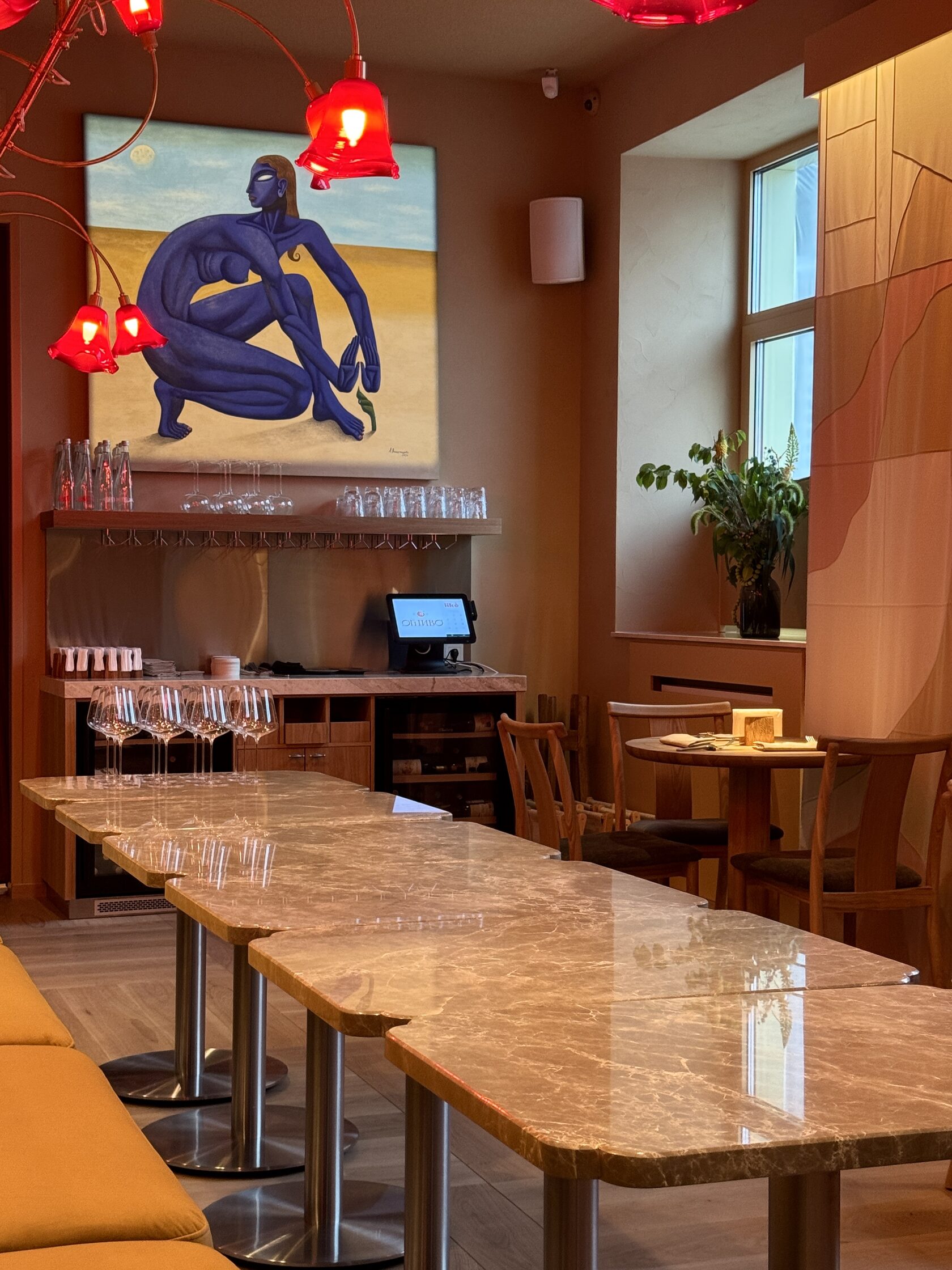 В винном зале вдоль окон размещено панно Эли Винокуровой «Белые сны». Оно передает легкость зимних грез — это намек на заснеженные пейзажи, морозные узоры и полупрозрачные сновидения. Здесь же — картина Алины Виноградовой Prithvi Mata (с санскрита Prithvi переводится как «земля», а также является именем богини, олицетворяющей ее в индуизме). В работах художницы переплетаются мифологии разных культур. В большом зале на стене — панно из обугленного дерева Лины Дыговой «Бурка», символизирующее силу и мудрость.