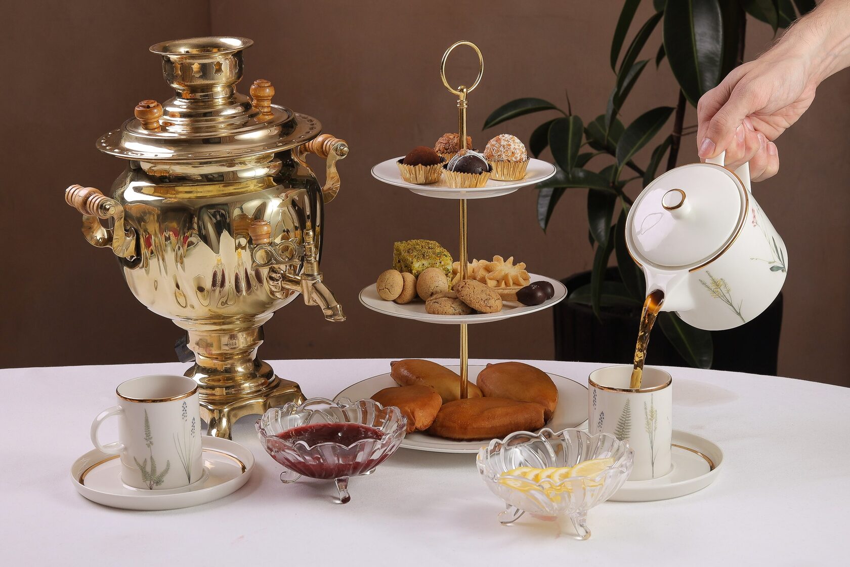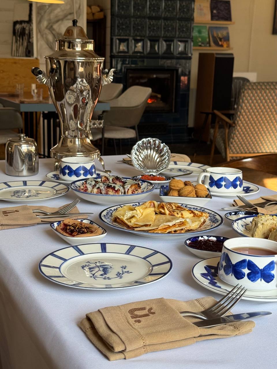 Самовар с чаем подают с блинами с красной икрой, ягодным пирогом, фисташковыми профитролями, орешками с вареной сгущенкой, вареньем и цукатами из шишек.