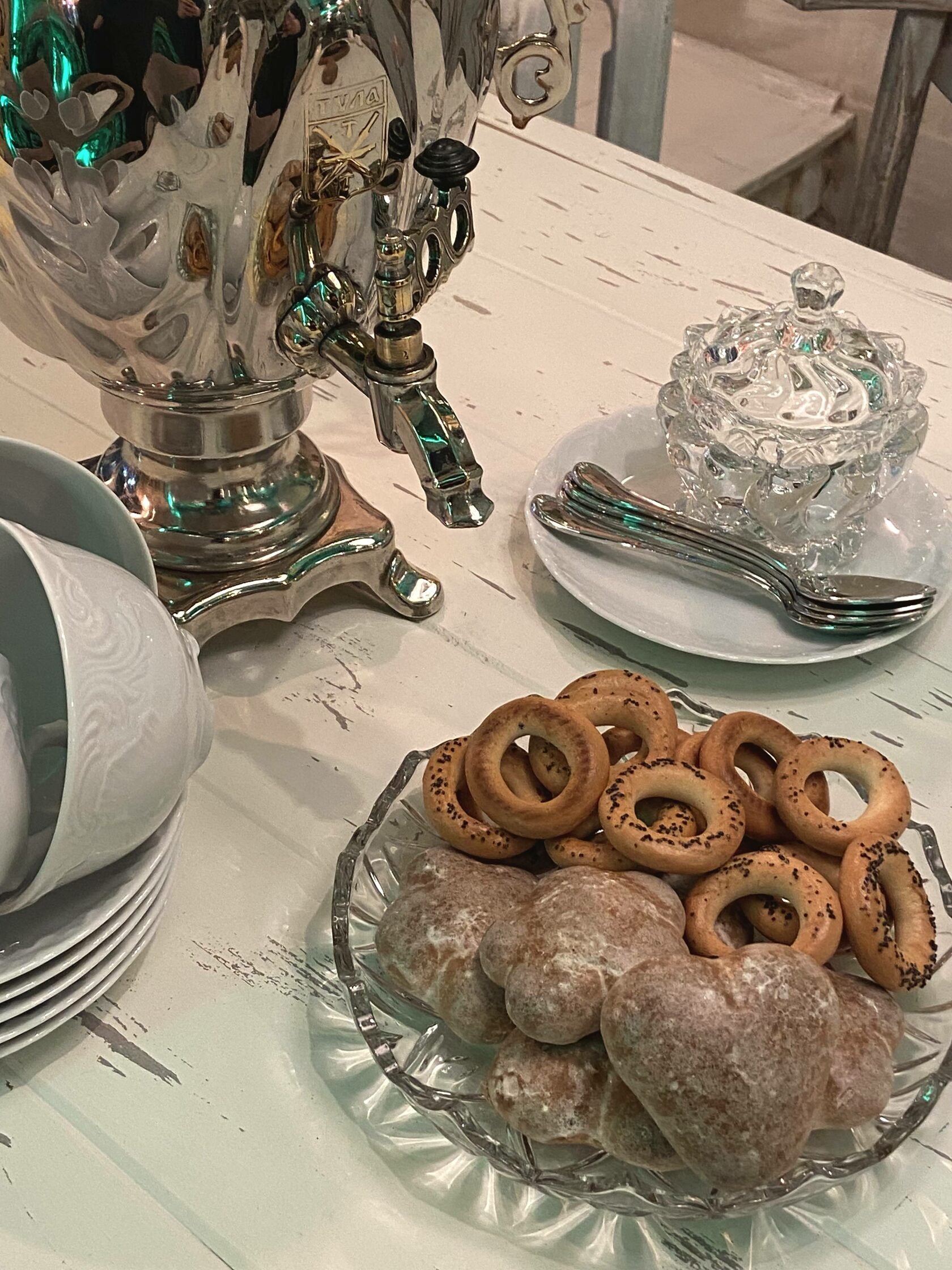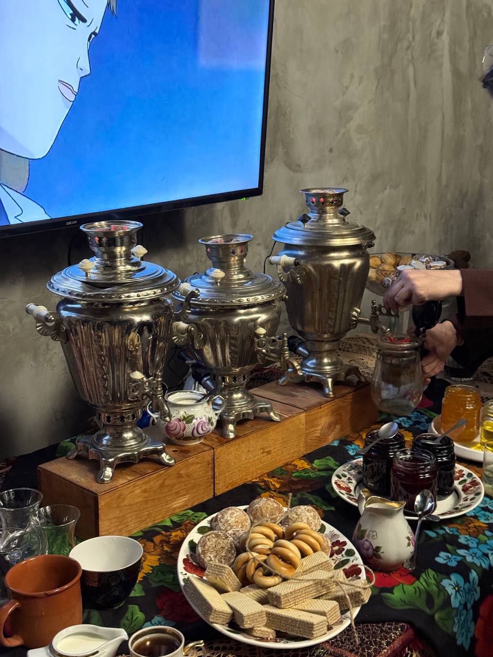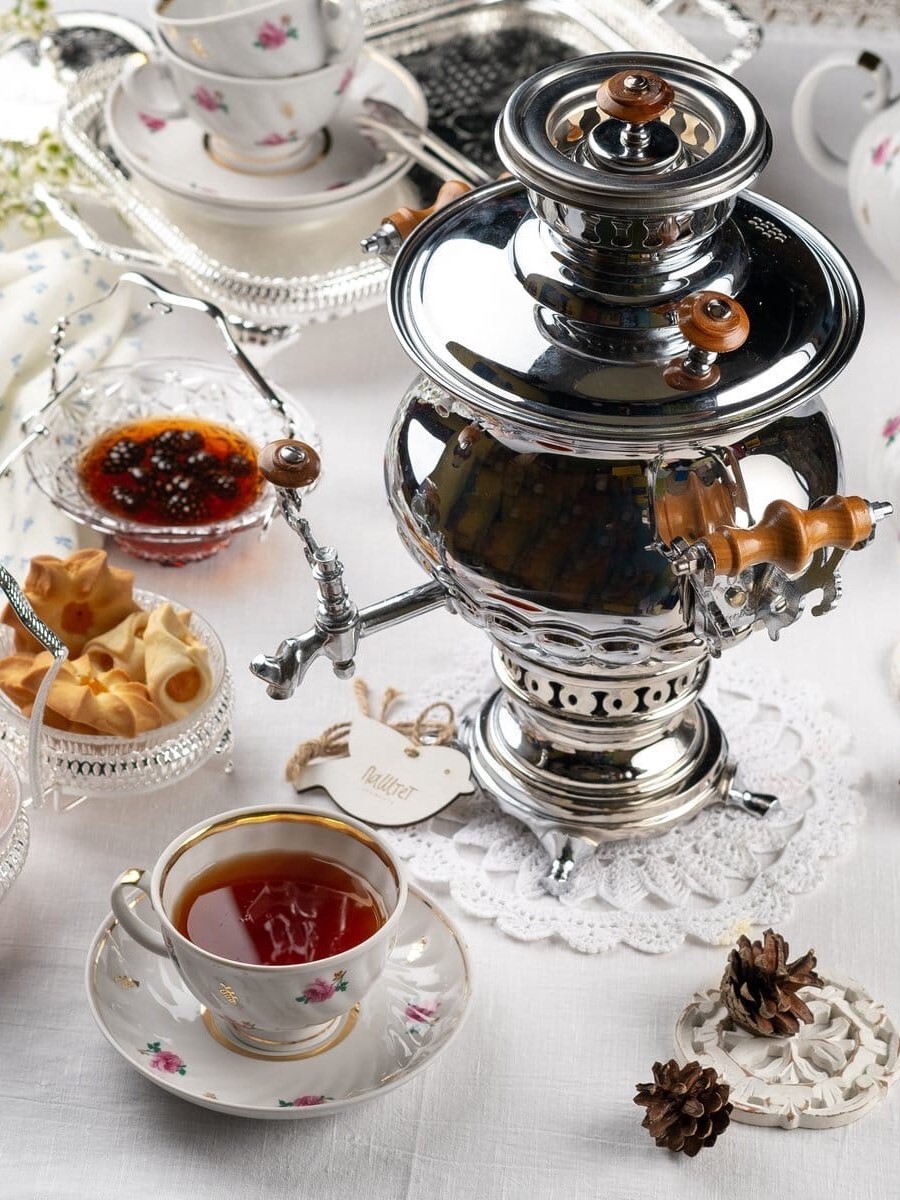Здесь для гостей ставят три самовара — два чайных и один кофейный, а скоро появится и самовар с глинтвейном. Каждая церемония сопровождается короткой лекцией про чайные традиции на Руси. Напиток подают с вареньем, медом и сладостями — сушками, вафлями и «орешками» со сгущенкой. Кофе готовят по традициям времен Петра I — с маслом и солью.