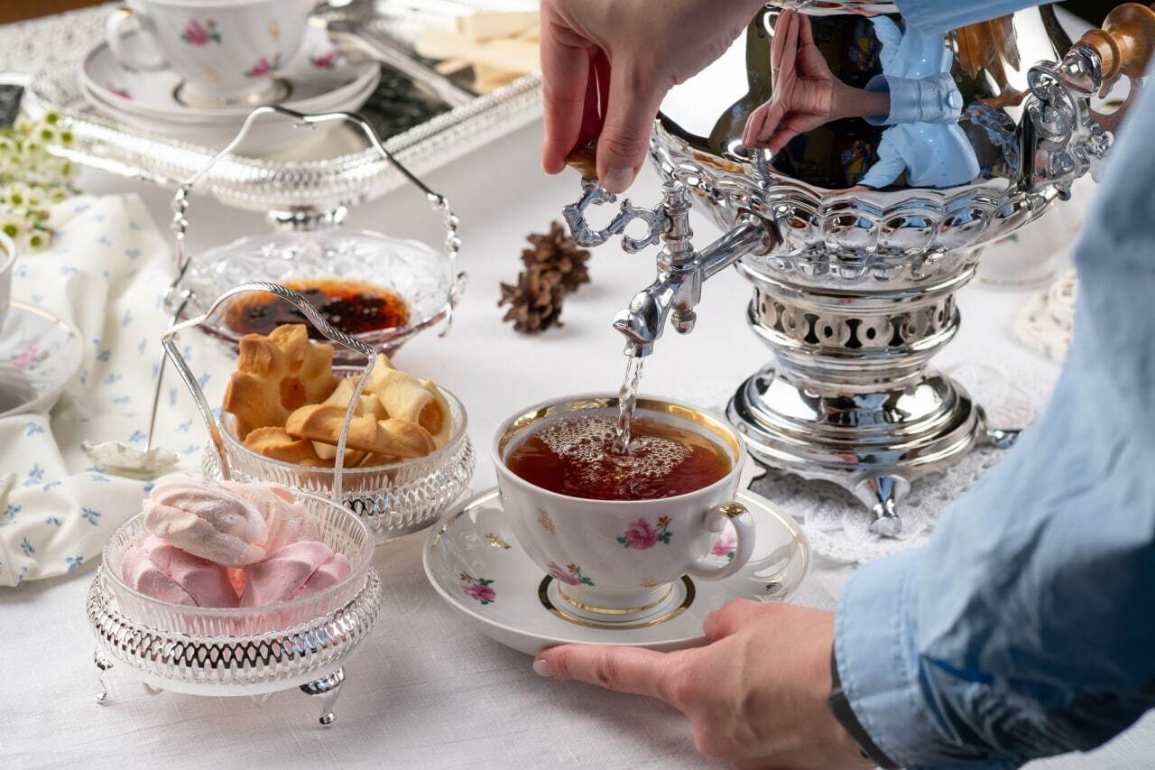 Для чаепития команда заведения выносит посуду из Дулевского фарфора, а на центральное место стола ставит самовар. В чаепитие на четверых входят черный классический чай или чай с душистыми травами, лимон, домашнее малиновое варенье и ассорти: авторские конфеты, домашнее печенье и пирожки с капустой.