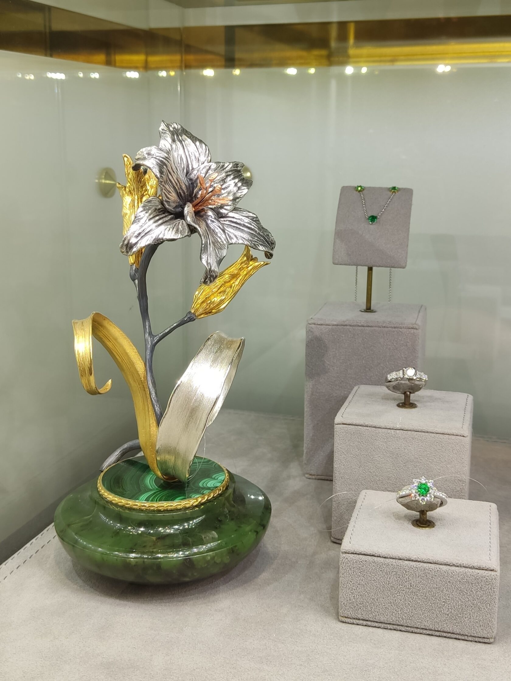 Ювелирный бренд «РИНГО» уже более 30 лет создает украшения на Урале. Во флагманском салоне представлено колье «Райские птицы» с огромным изумрудом-кабошоном. Этот минерал признан национальным достоянием: он был добыт на Малышевском месторождении — единственном на континенте месторождении изумрудов — и долгие годы провел в Государственном хранилище России. Позже бренд выкупил камень и поместил в это колье.