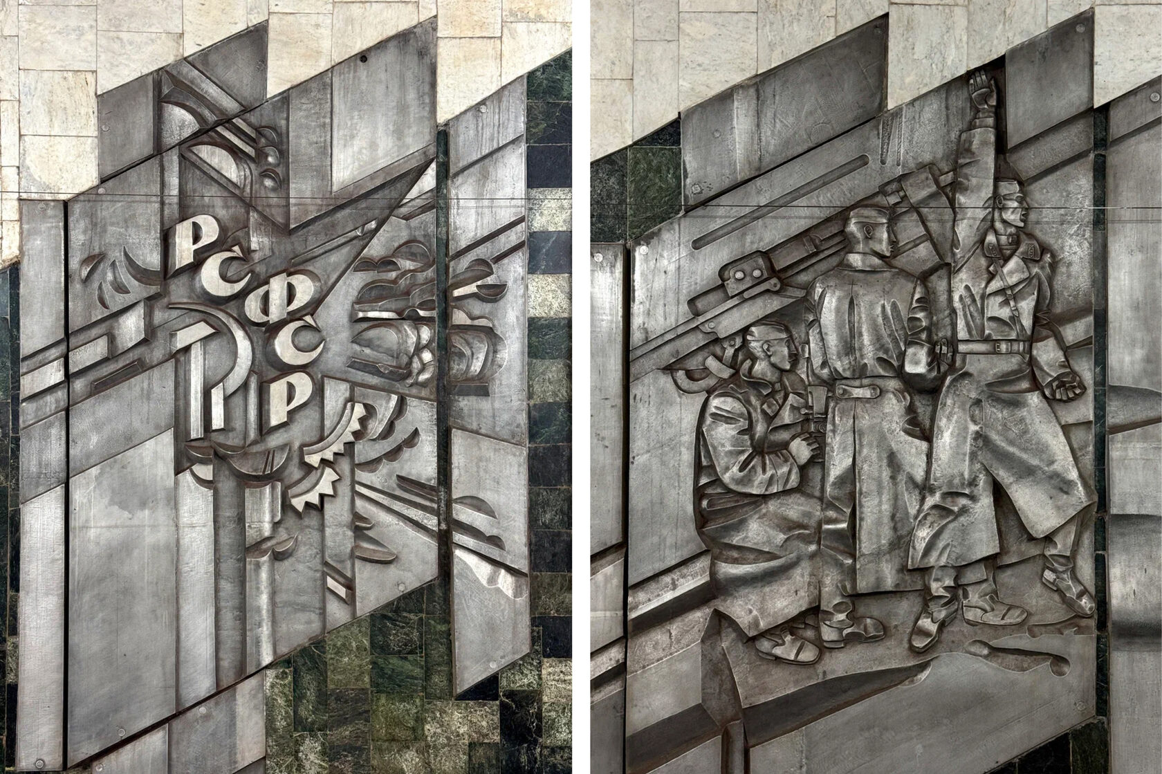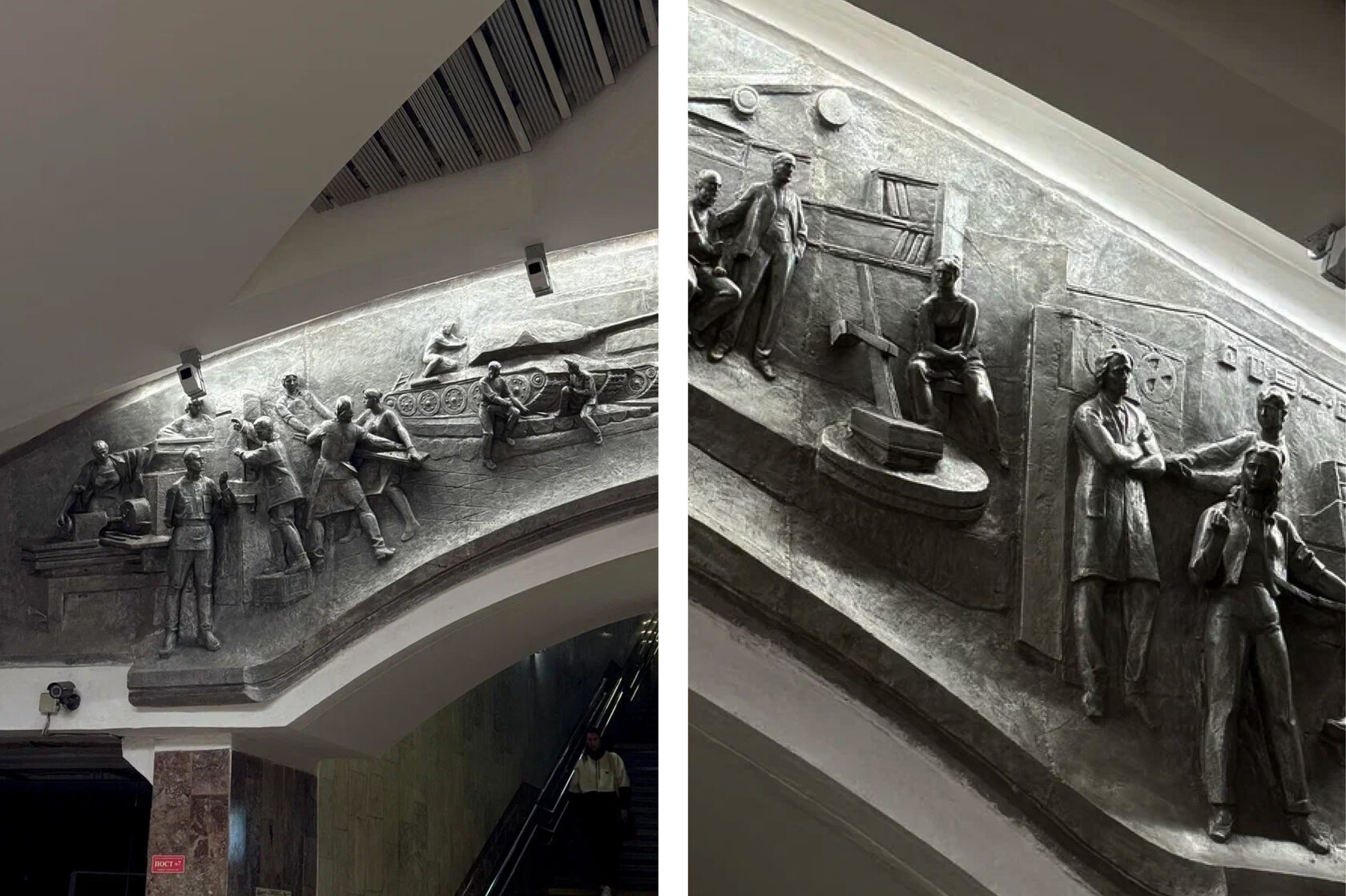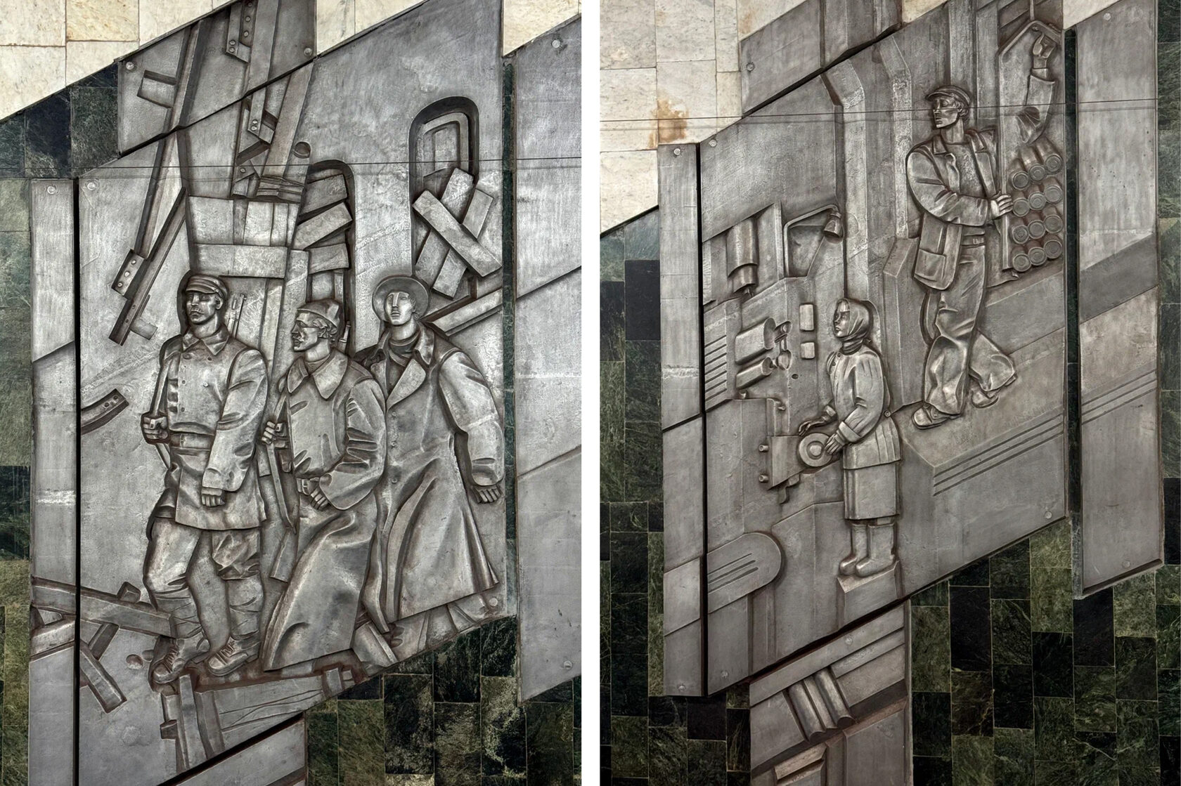 Отметим еще две работы художников-скульпторов. В вестибюле станции «Проспект Космонавтов» были смонтированы рельефы «Прощание» и «Встреча» художника Бориса Клочкова, а над спусками в вестибюль станции метро «Уралмаш» появились скульптурные композиции за авторством Владимира Егорова.