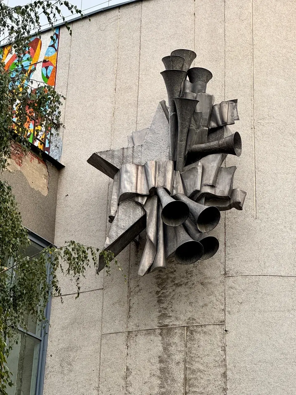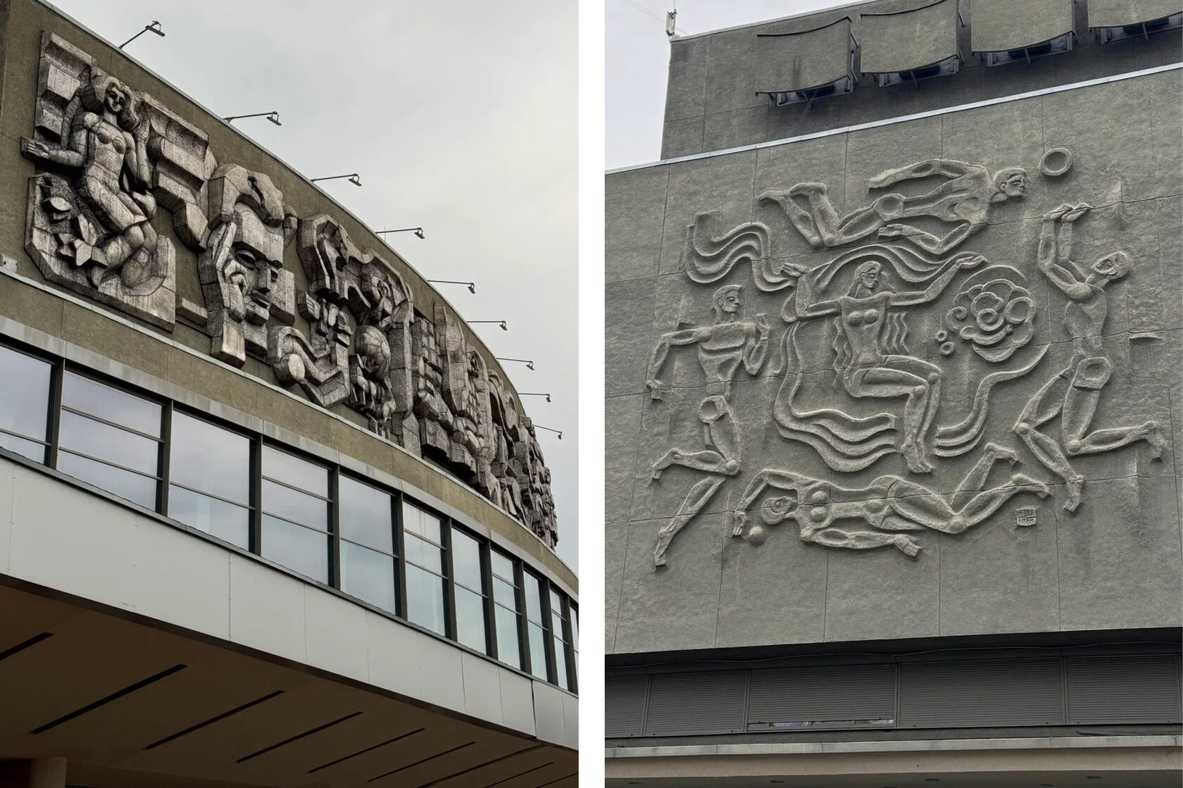 Другой интересный пример авторства того же дуэта — барельефная композиция на фасаде бывшего «Салюта», который открылся уже в новом качестве.