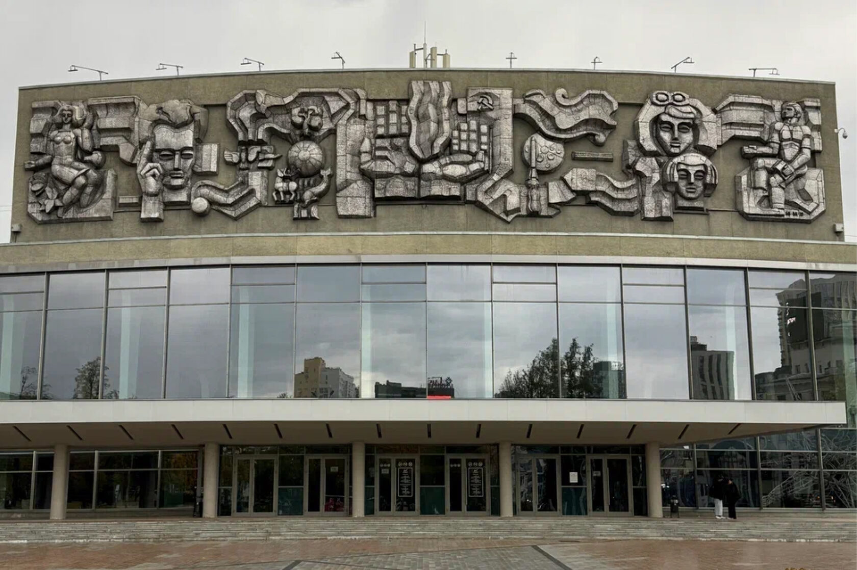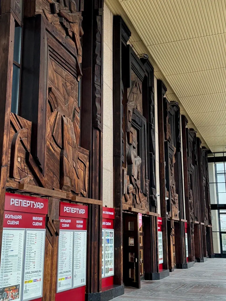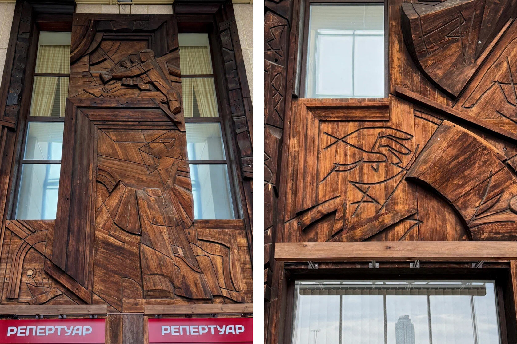 Более поздний пример фасадного убранства (1990) и один из самых впечатляющих сегодня скрыт от глаз: в 2000-е модернистский Драмтеатр накрыли стеклянно-пластиковым куполом (целесообразность спорна). Речь о резных деревянных порталах Вениамина Степанова — 12 монументальных композиций, опоясывающих здание с трех сторон. В отличие от цирка, художник говорит языком аллегорий: творение из хаоса, полет Икара, Георгий со змеем, Пьета — сцена оплакивания Христа Марией.