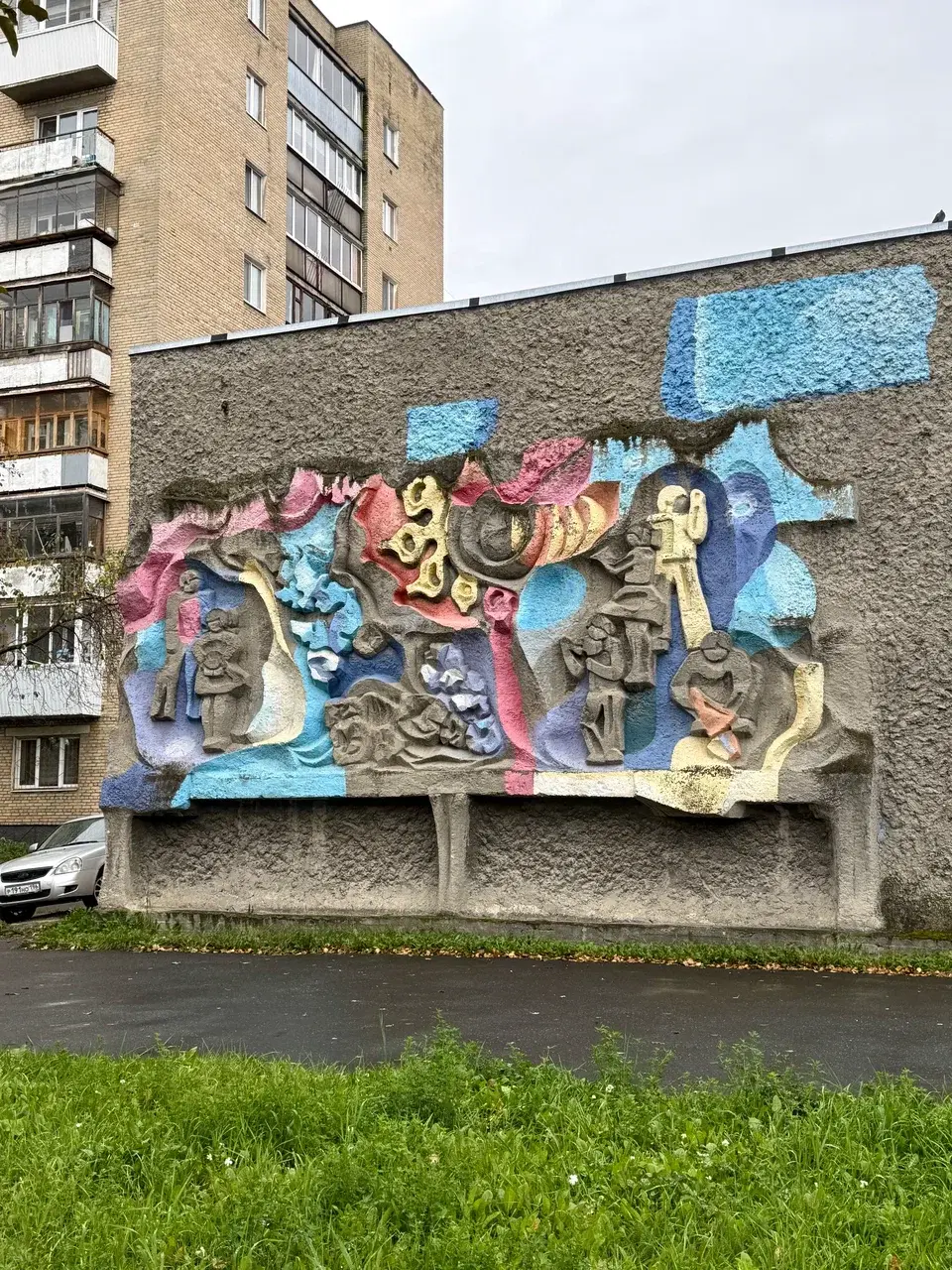 Бетонные фасады Дворца молодежи, подарка городу к 250-летию (1973), украсили барельефы Виталия Беляева и Леопольда Венкербеца. На парковом фасаде разместилось панно со спортивным сюжетом — рядом находился вход в спортзал.