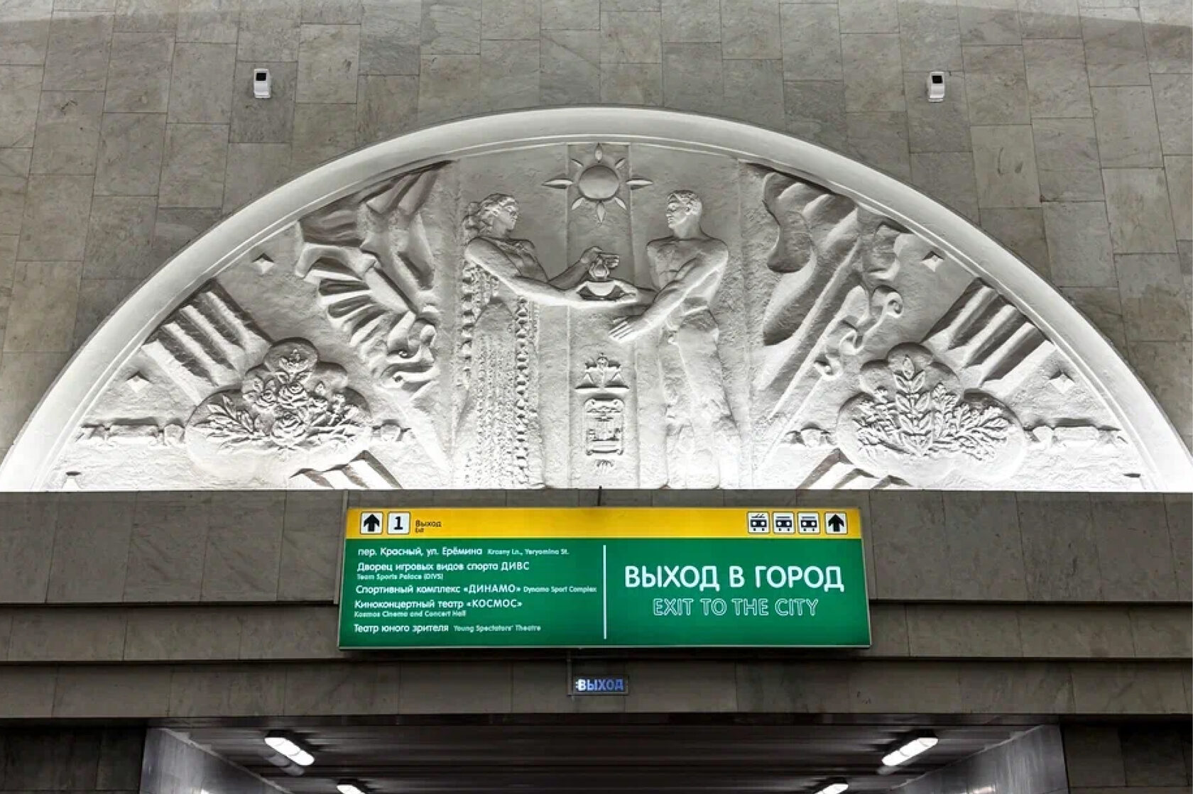 Первое, на что обращаешь внимание на станции — скульптура античного «Дискобола», выполненная Виталием Беляевым. В свое время она вызвала горячую дискуссию как не соответствующая контексту: «Почему бы на пьедестал не поставить скульптуру конькобежца?» Также над проходом к эскалаторам расположен барельеф, изображающий юношу и девушку — символ гармонии.