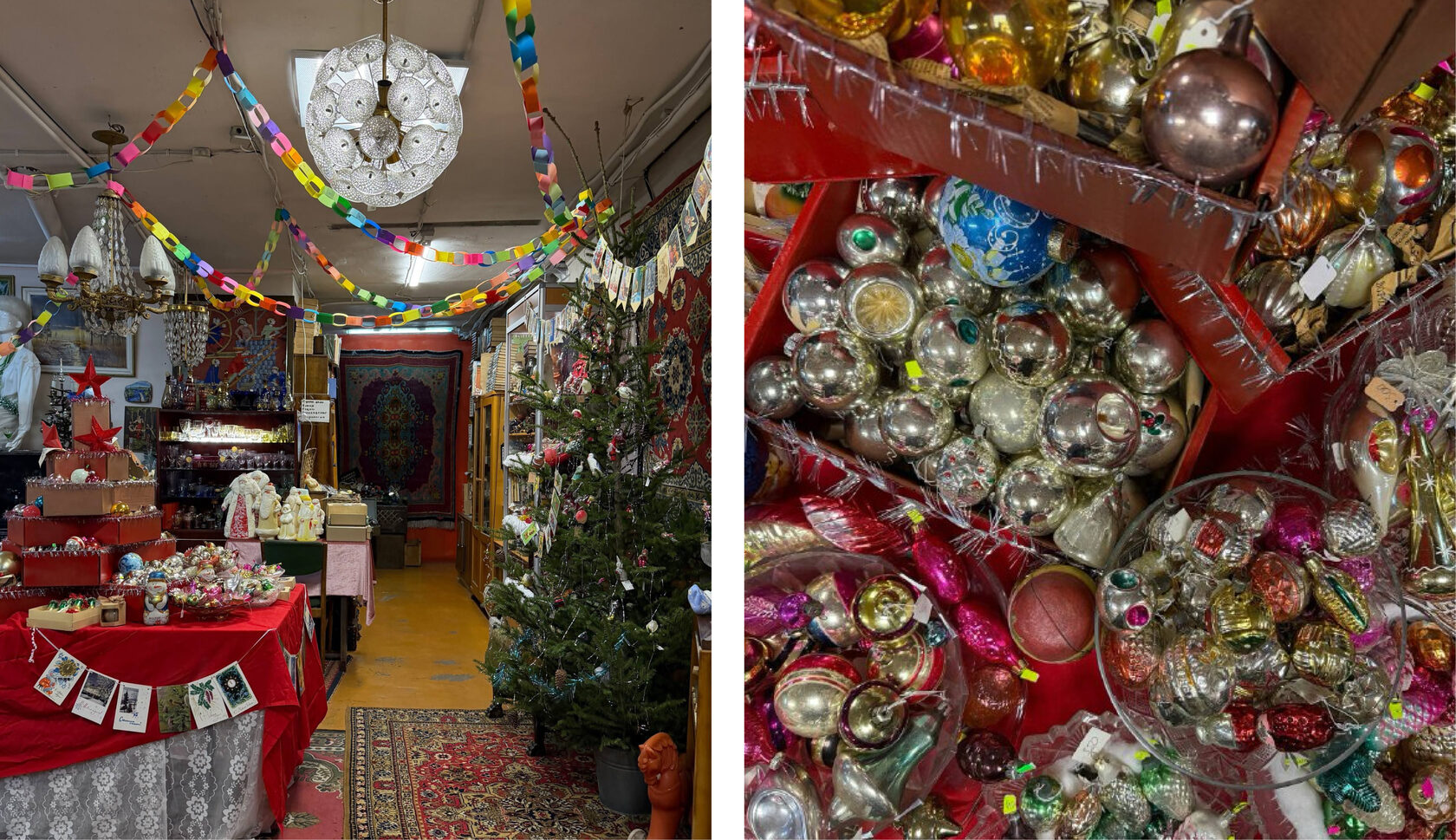 В экспозиции — новогодние украшения, знакомые с детства: стеклянные шарики, сосульки и абстрактные формы, игрушки из ваты и стекляруса, а также картонажи в виде животных — фигурки из прессованного картона, покрытые серебряной или золотой краской. Большую часть игрушек можно купить.