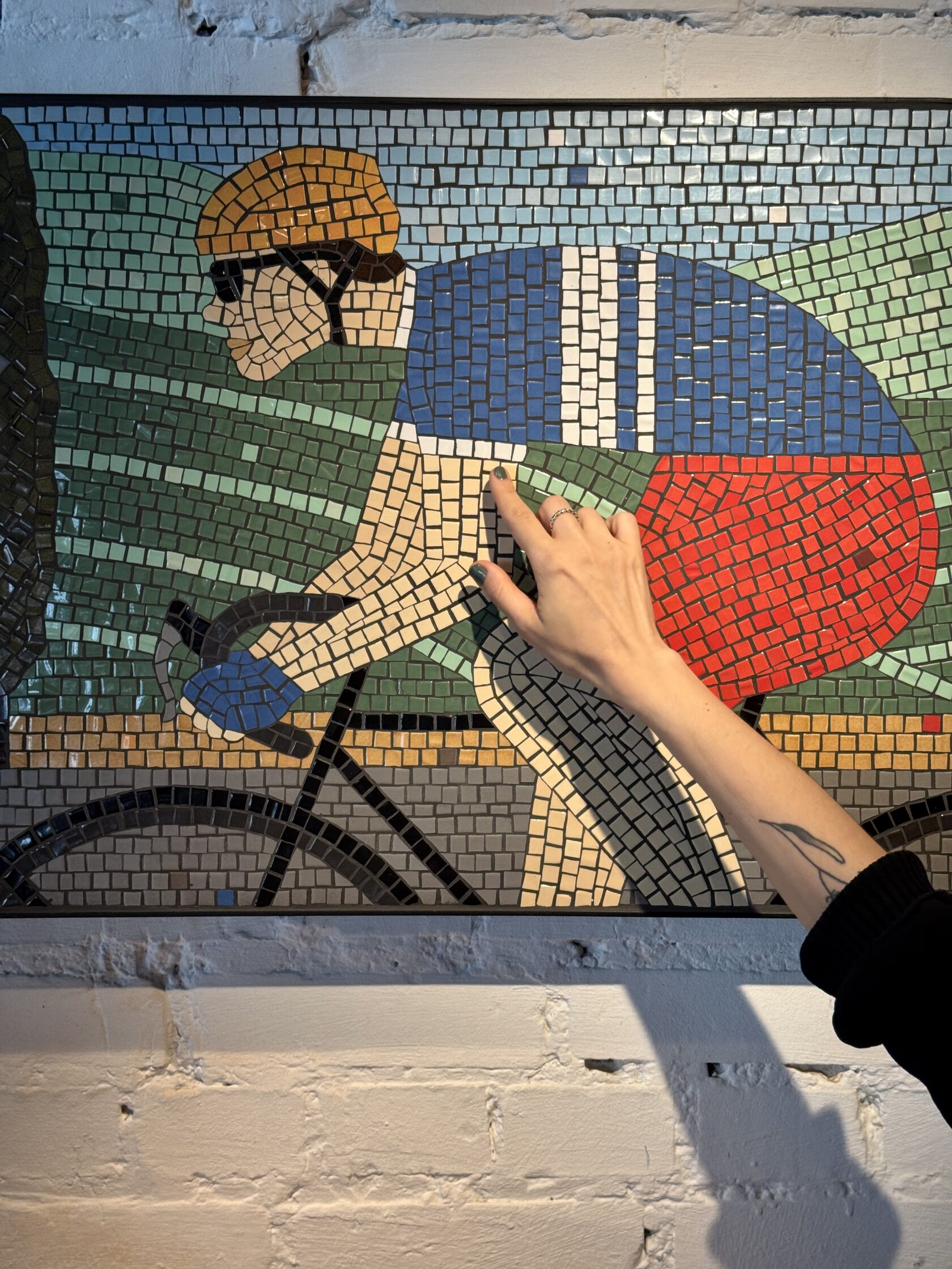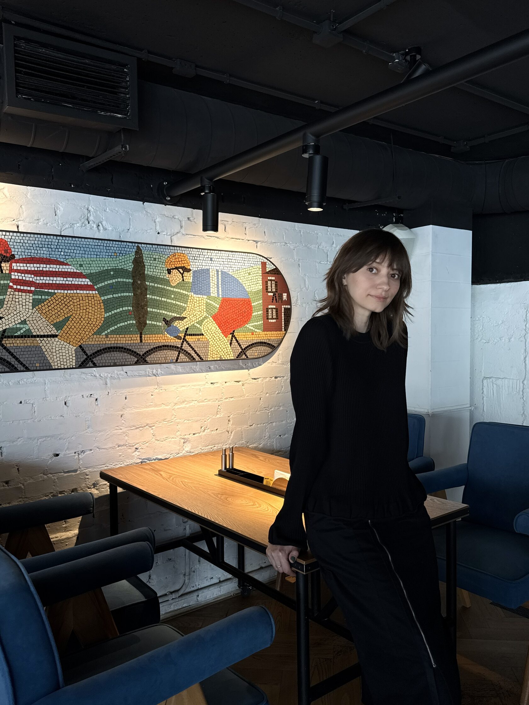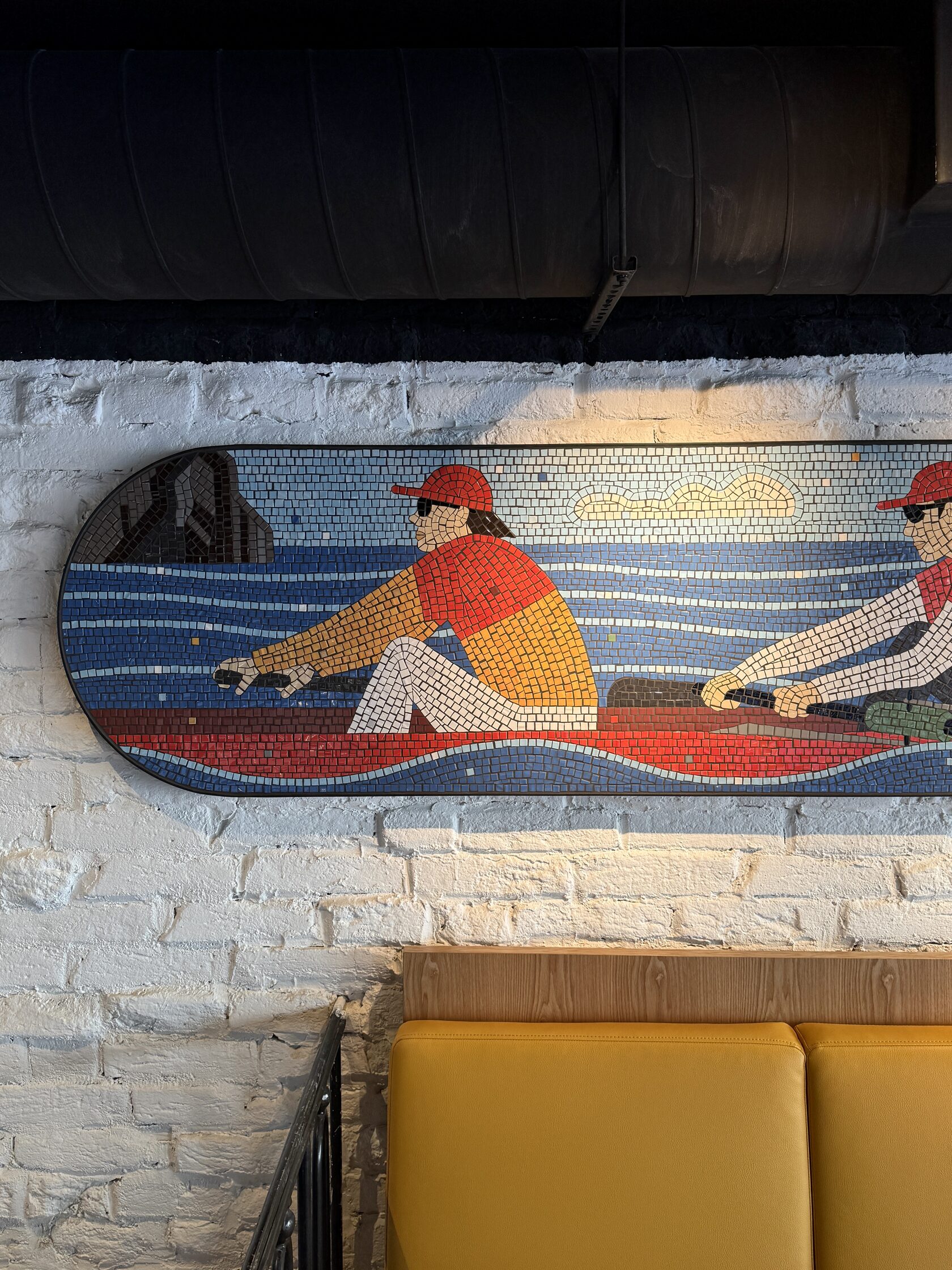 Дизайнер интерьера Maccheroni Ашот Карапетян продумал вытянутую форму мозаик. Глядя на нее, я сразу представила гребцов с их длинными лодками. Тема спорта откликнулась, и появились велосипедисты.