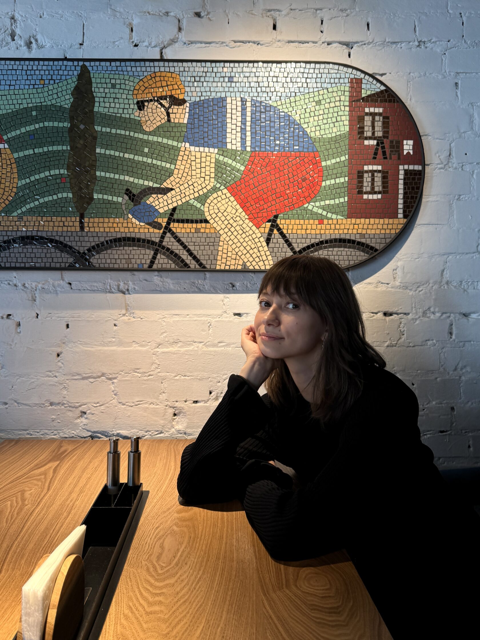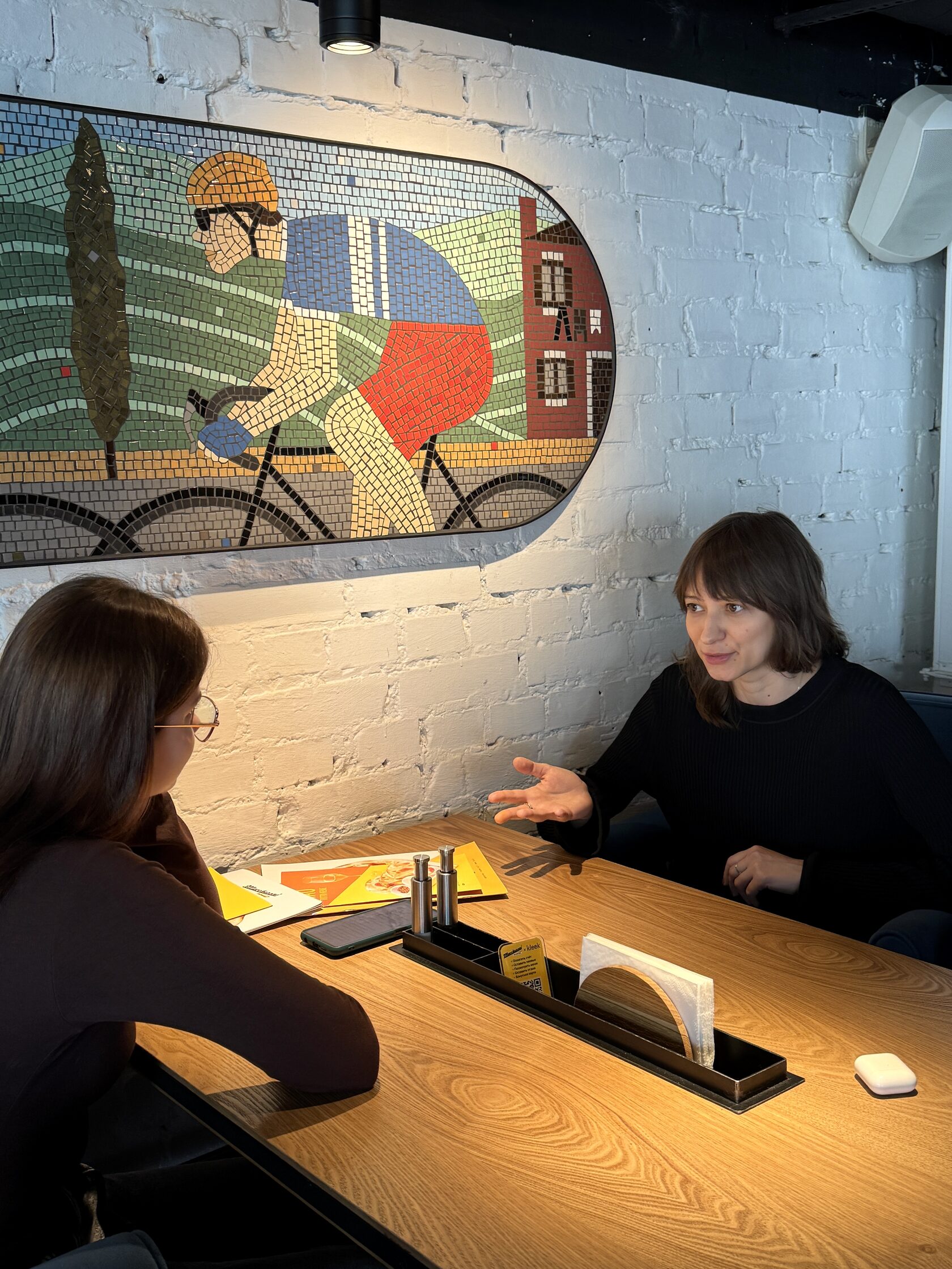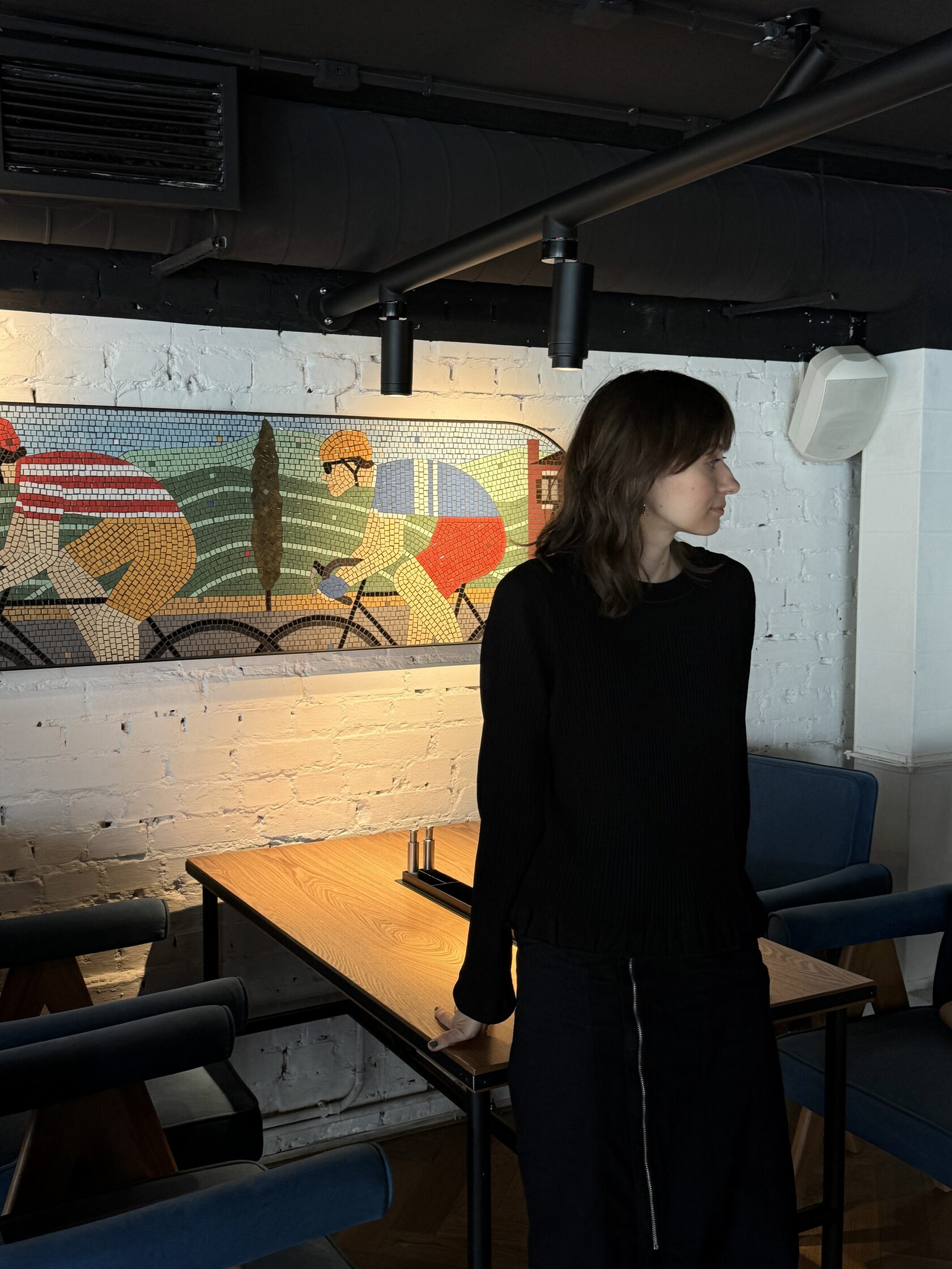 Дизайнер интерьера Maccheroni Ашот Карапетян продумал вытянутую форму мозаик. Глядя на нее, я сразу представила гребцов с их длинными лодками. Тема спорта откликнулась, и появились велосипедисты.