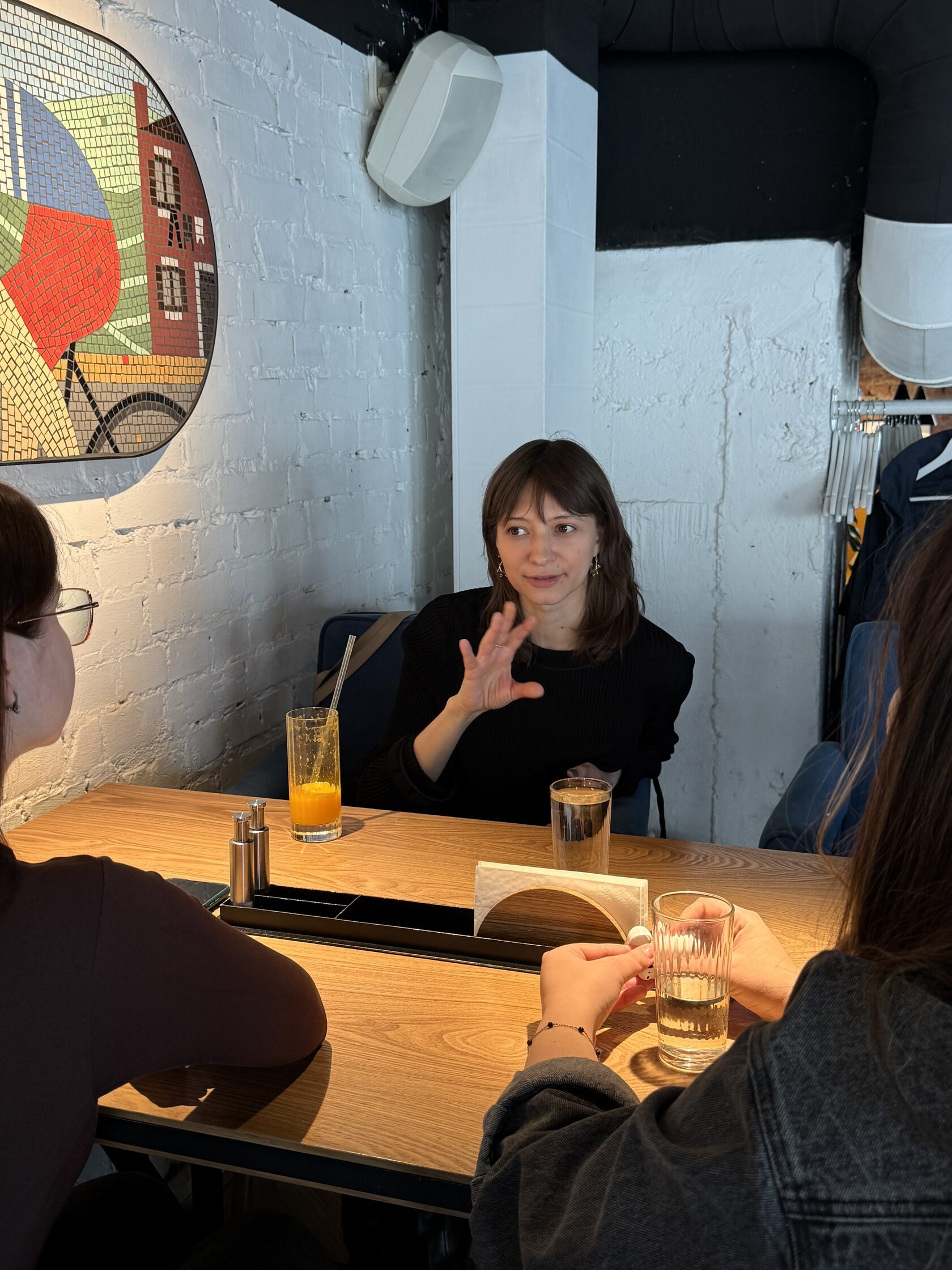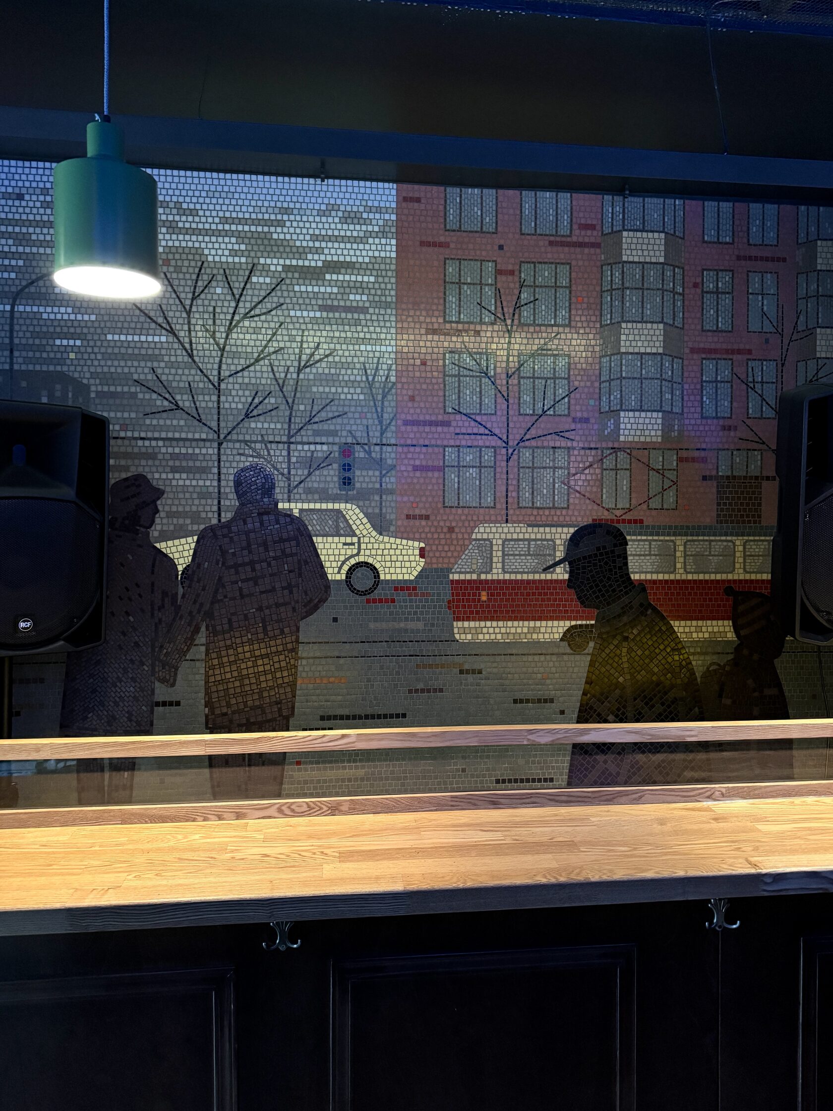 Во время обсуждения с сооснователем заведения Женей Кабановым мы решили, что можно использовать районную тему. Глядя в пустую стену бара, мы представили, что ее нет, а за ней виден город с трамвайной линией и уголком Городка чекистов. Потом нашли фотографию того самого ракурса — все сошлось. Эскиз нарисовали и согласовали очень быстро.