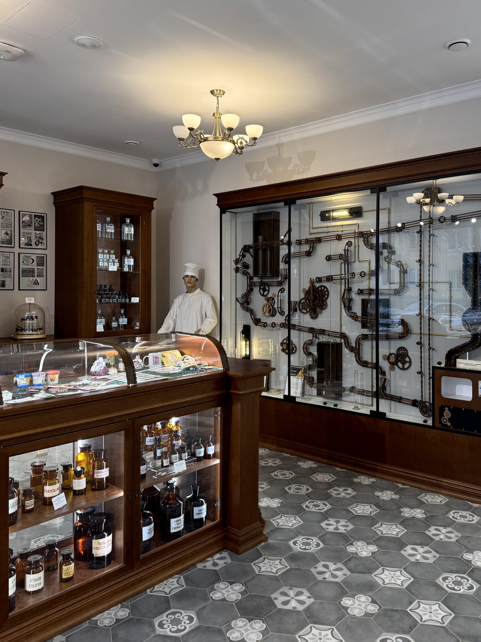 Современная аптека, открывшаяся недавно, напоминает мини-музей истории медицины: старинные баночки, весы, травы и медицинские приборы. Интерьер оформлен в классическом стиле с высокими потолками и медным блеском, а ассортимент включает редкие препараты и витамины.